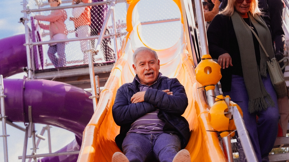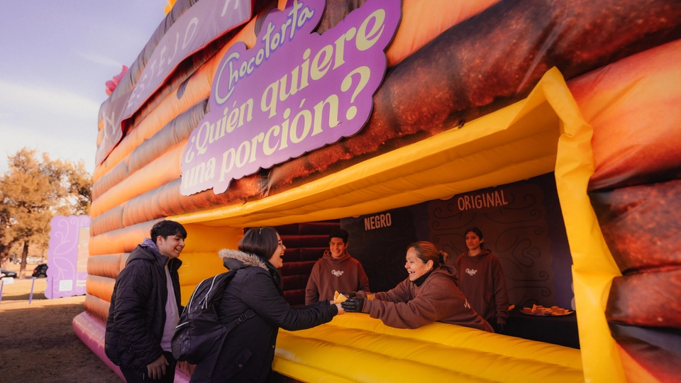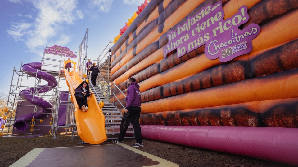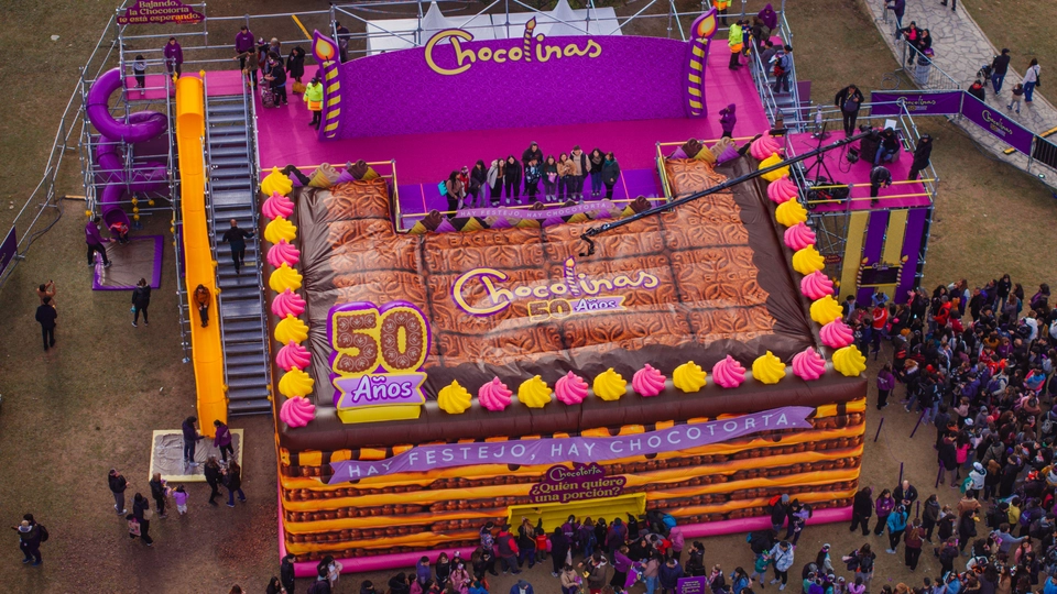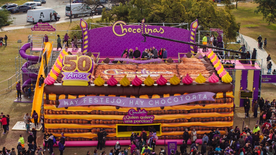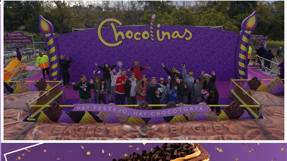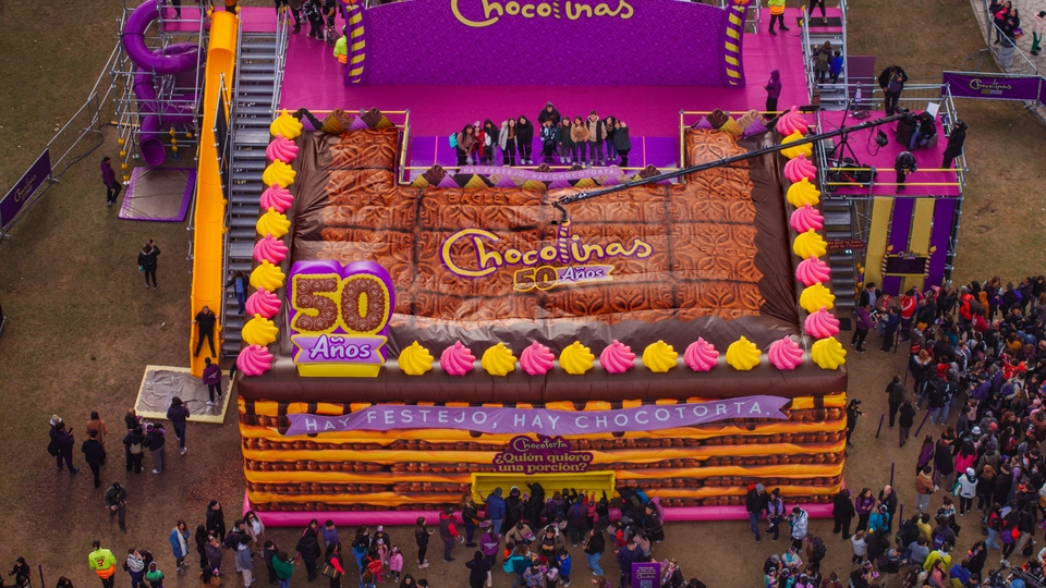 2. La “Experiencia Chocotorta” como activación central permitiendo que miles de personas sean “parte” de la torta conmemorativa en un circuito atractivo, lúdico y memorable, dejando en claro que la Chocotorta es de Chocolinas. Las experiencia se basó en una réplica de la Chocotorta en escala monumental de 6m de altura, con un circuito interactivo que permitió al público subir a la superficie para “hacerse parte” de la torta conmemorativa en una foto personalizada para compartir en redes, invitándolos también a descender en dos toboganes muy divertidos y recibir como regalo una porción de torta.