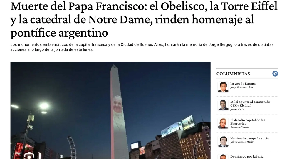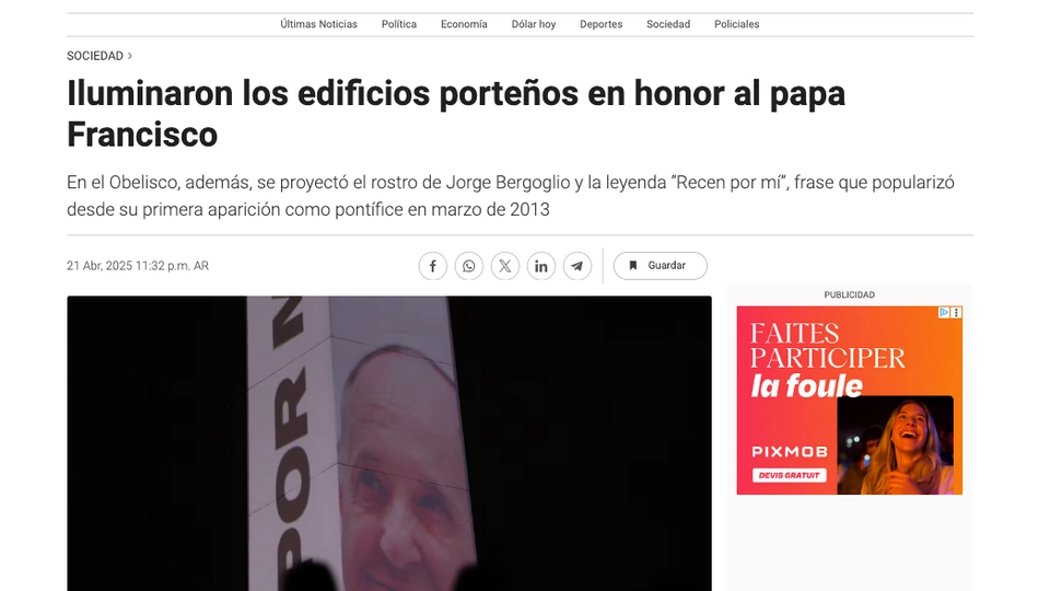 En el marco del fallecimiento del Papa Francisco, la ciudad de Buenos Aires realizó un mapping en el Obelisco, con el fin de homenajear al sumo pontífice: